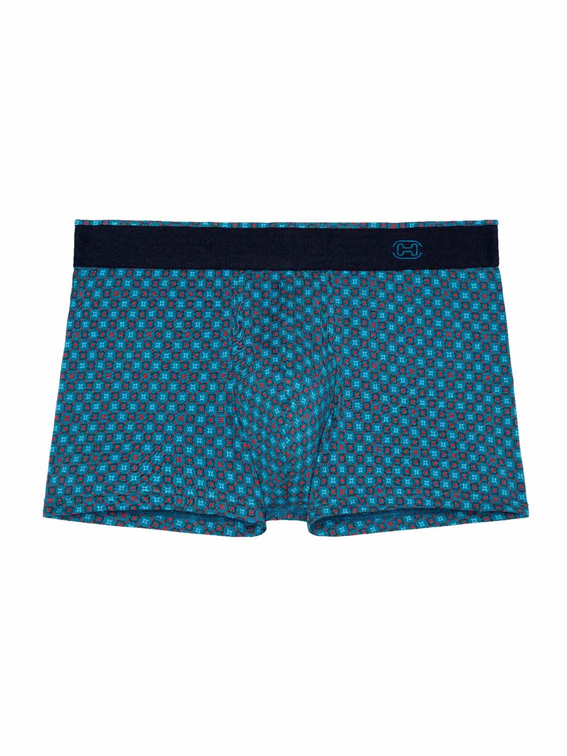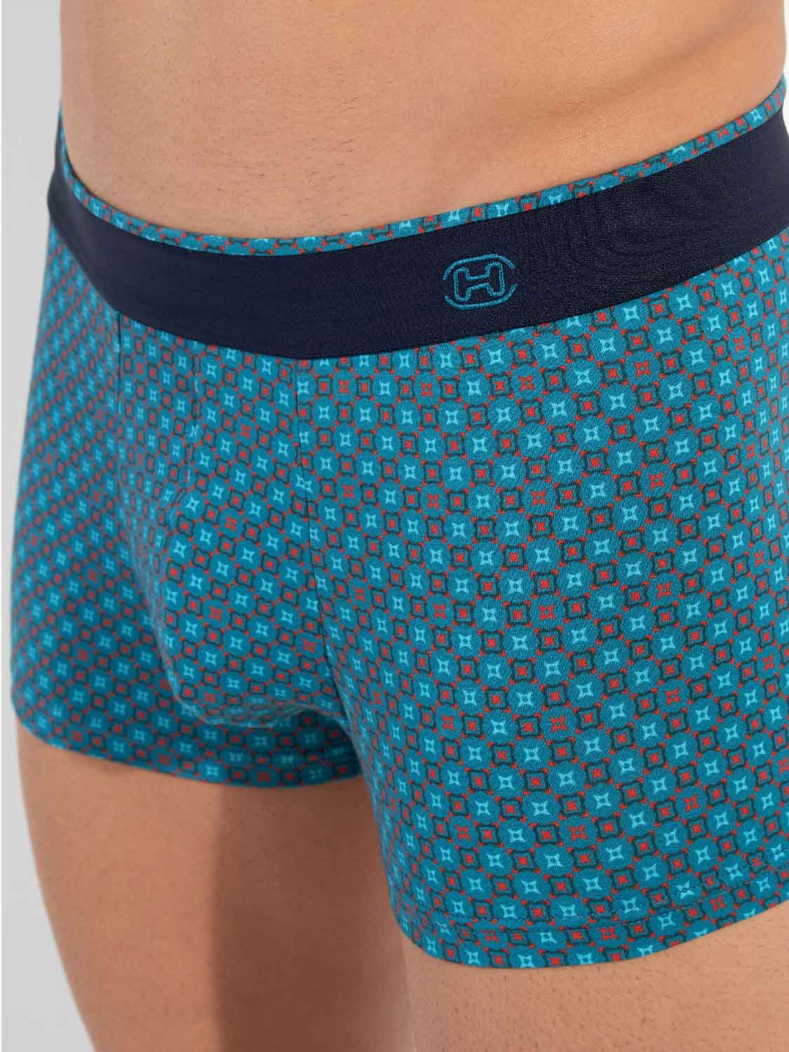 De Kuta - Comfort Boxer Briefs is gemaakt van comfortabel katoenmodal en uitgevoerd met een comfort heupband, waarbij de stof over de elastische band naar binnen is geslagen voor extra comfort. Linksvoor op de comfortband is een klein label van HOM geplaatst. De Kuta heeft een speelse micro print in turquoise met oranje op een lichtblauwe achtergrond.