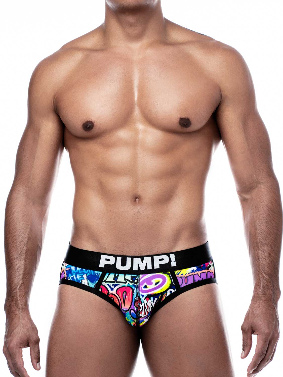 De Drip - Brief is een stoere heren slip PUMP! met een kleurrijke graffiti print gemaakt van een elastische polyester microfiber body rondom, voor optimaal comfort en flexibiliteit. De plaatsing van de graffiti-print is op elk slip anders, waardoor elk exemplaar uniek is. De vochtafvoerende, duurzame microfiber body houdt je koel, terwijl de zwarte elastische tailleband, geaccentueerd met de klassieke PUMP! logo, zorgt voor een goede en comfortabele pasvorm.