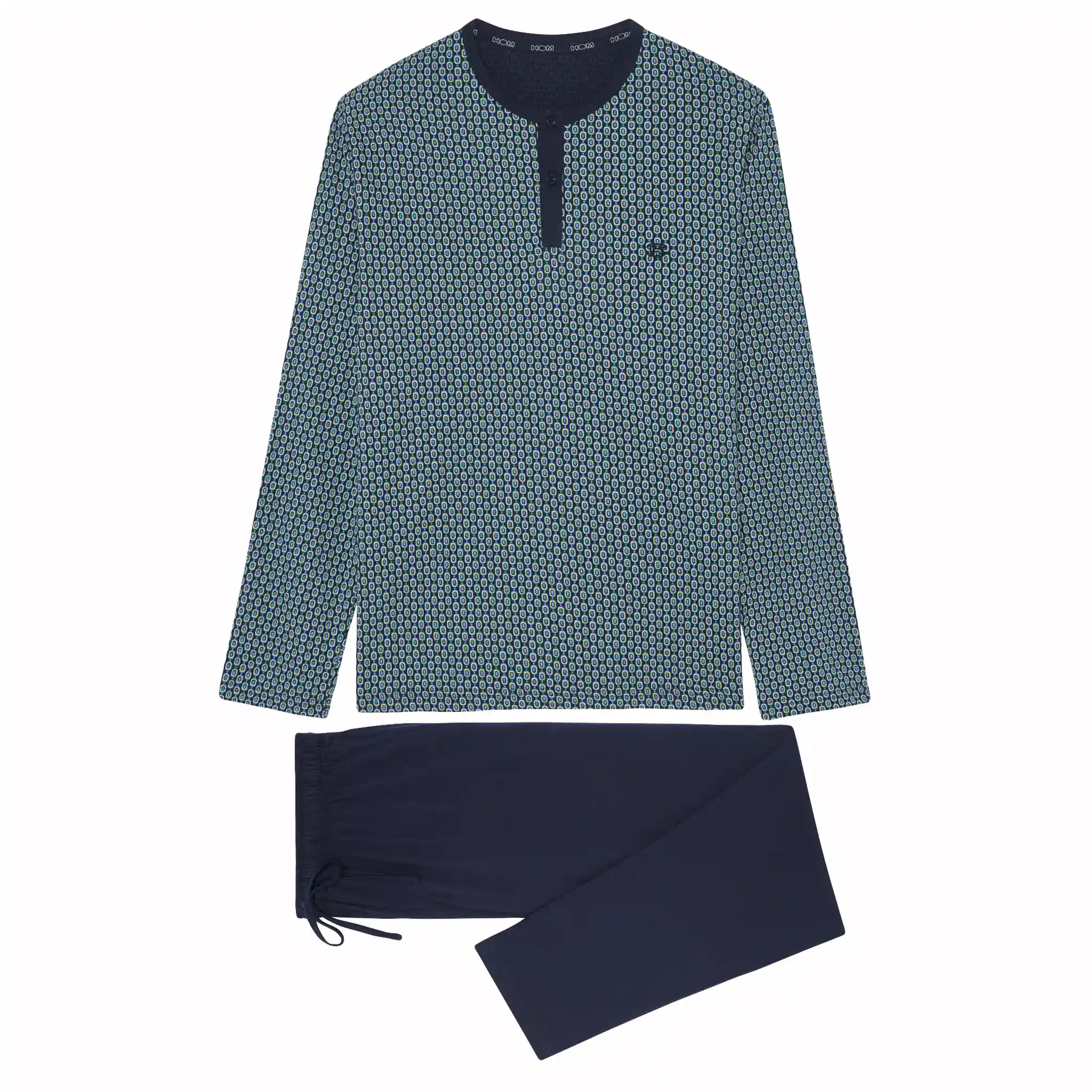 De Andy heren pyjama is gemaakt van 100% jersey katoen. Het T-shirt met lange mouwen, is uitgevoerd met een rondje hals en klassieke opening. Het shirt heeft een print met ovaaltjes uitgevoerd in lichte tinten groen op een marine blauwe achtergrond. De lange broek in effen zwart heeft steekzakken in de zoom aan de linker en rechterzijde. De tailleband is elastisch en heeft een trekkoord. Doordat de pyjama is gemaakt van katoen is deze gemakkelijk schoon te maken en ademt deze goed. Perfect voor de man die graag natuurlijke stoffen draagt.