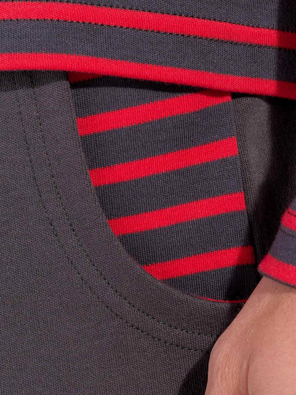 De Carson - Long Sleepwear is gemaakt van 100% katoen, gebreiden in een interlock. De pyjama beschikt over een T-shirt met lange mouwen en een ronde kraag. De lange broek is effen uitgevoerd in de kleur grijs, met steekzakken in de zoom aan de linker en rechterzijde. De lange broek beschikt over een trekkoord om de broek perfect op maat te brengen. Het shirt is uitgevoerd in 2 soorten garen, afwisselend gebreiden in rood en grijs (geen print). Linksvoor op het shirt is het HOM logo geborduurd.