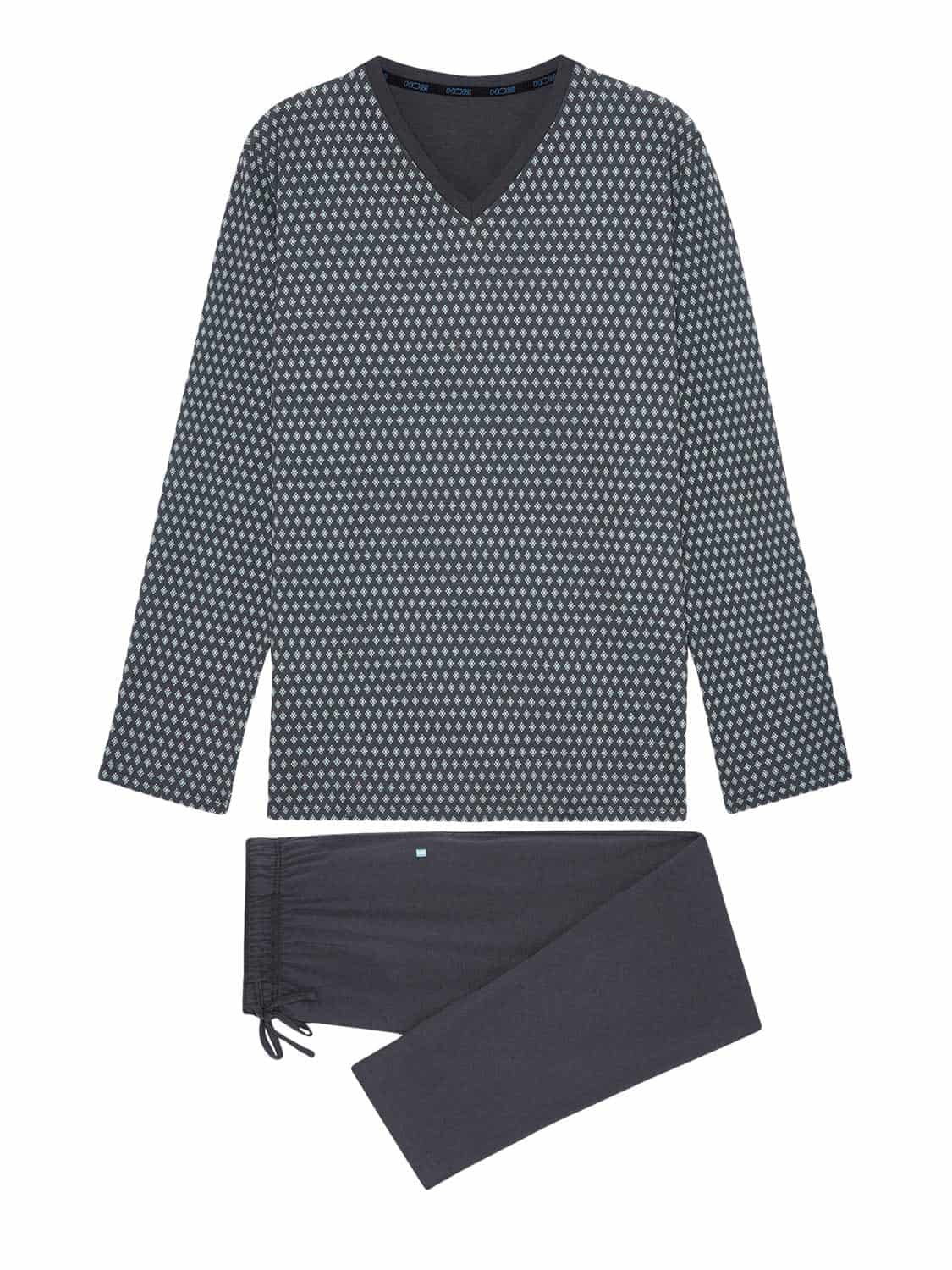 De Jaipur - Pyjama siert zich in eenvoud met een ruitprint op het shirt. De pyjama is gemaakt van 100% jersey katoen en beschikt over een shirt met lange mouwen en een V-hals. De lange broek is effen uitgevoerd in de kleur donker grijs, met steekzakken in de naad aan zowel de linker en rechterzijde. De lange broek heeft een elastische heupband met een trekkoord voor een solide fit. Doordat de pyjama van katoen is gemaakt is deze makkelijk schoon te maken en perfect voor iedere man die graag natuurlijke stoffen draagt.