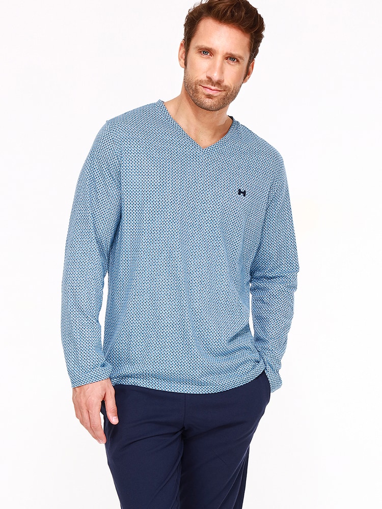 De Long Sleepwear Juan pyjama is een lange heren pyjama van 100% katoen gebreiden in een jersey en uitgevoerd in blauwe tinten. De set heeft een shirt met een V-hals en lange mouwen en een effen lange broek met steekzakken in de zoom genaaid. De broek heeft een elastische tailleband. Katoen ademt goed en is makkelijk school te maken. Perfect voor de man die enkel natuurlijke stoffen wil dragen.