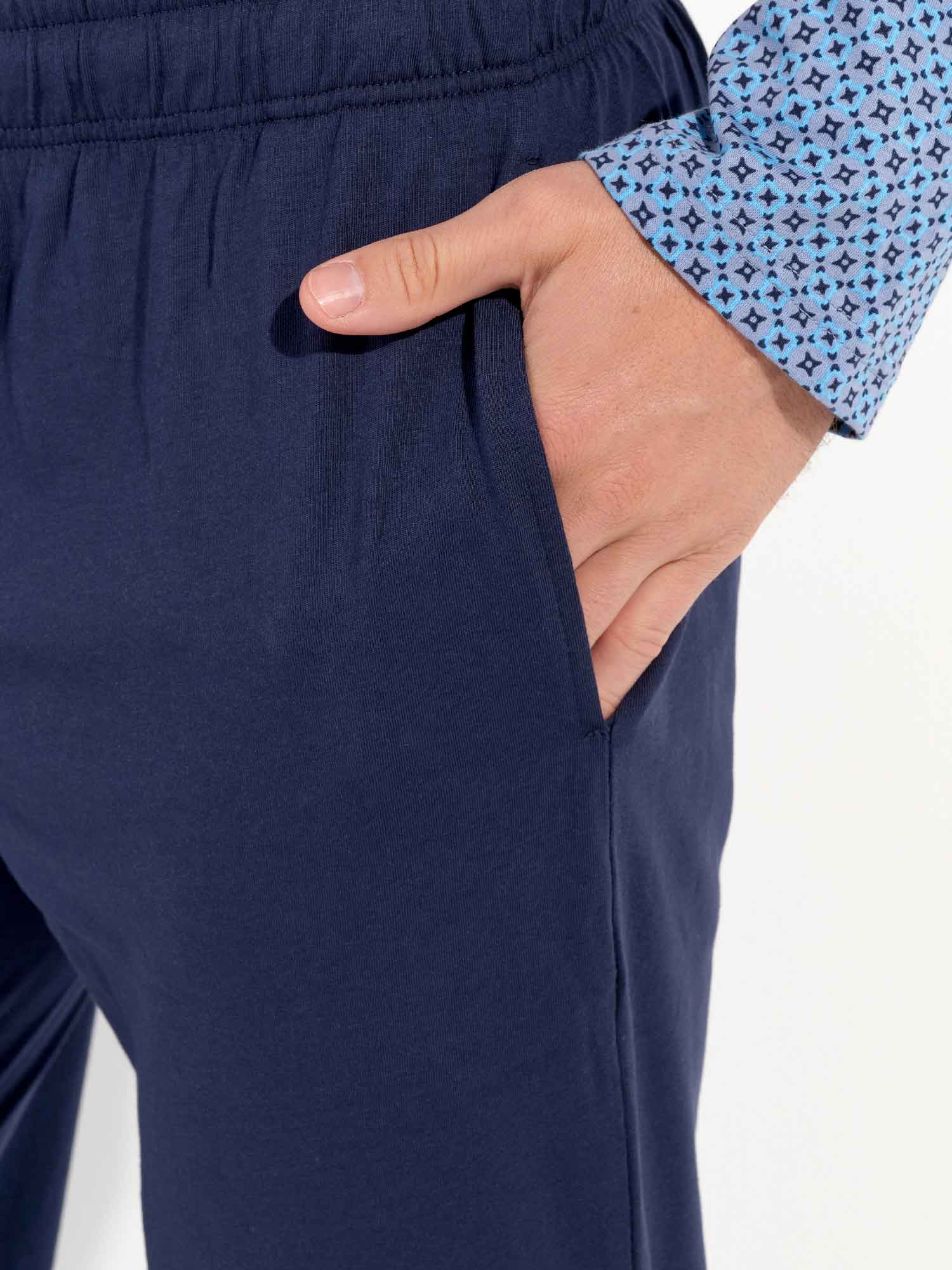 De Kuta - Long Sleepwear is gemaakt van 100% katoen uitgevoerd in een jersey. De pyjama beschikt over een T-shirt met lange mouwen en een ronde kraag. De lange broek is effen uitgevoerd met steekzakken in de zoom, aan de linker en rechterzijde. De lange broek beschikt over een trekkoord om de broek perfect op maat te brengen. Het shirt heeft een speels geometrische print.