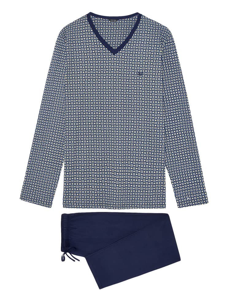 De Lices heren pyjama is gemaakt van 100% jersey katoen. Het T-shirt met lange mouwen is uitgevoerd met een V-hals en heeft een blauwe print. De lange broek in effen marine blauw heeft steekzakken in de zoom aan de linker en rechterzijde. De tailleband is elastisch en heeft een trekkoord. Doordat de pyjama is gemaakt van katoen is deze gemakkelijk schoon te maken en ademt deze goed. Perfect voor de man die graag natuurlijke stoffen draagt.