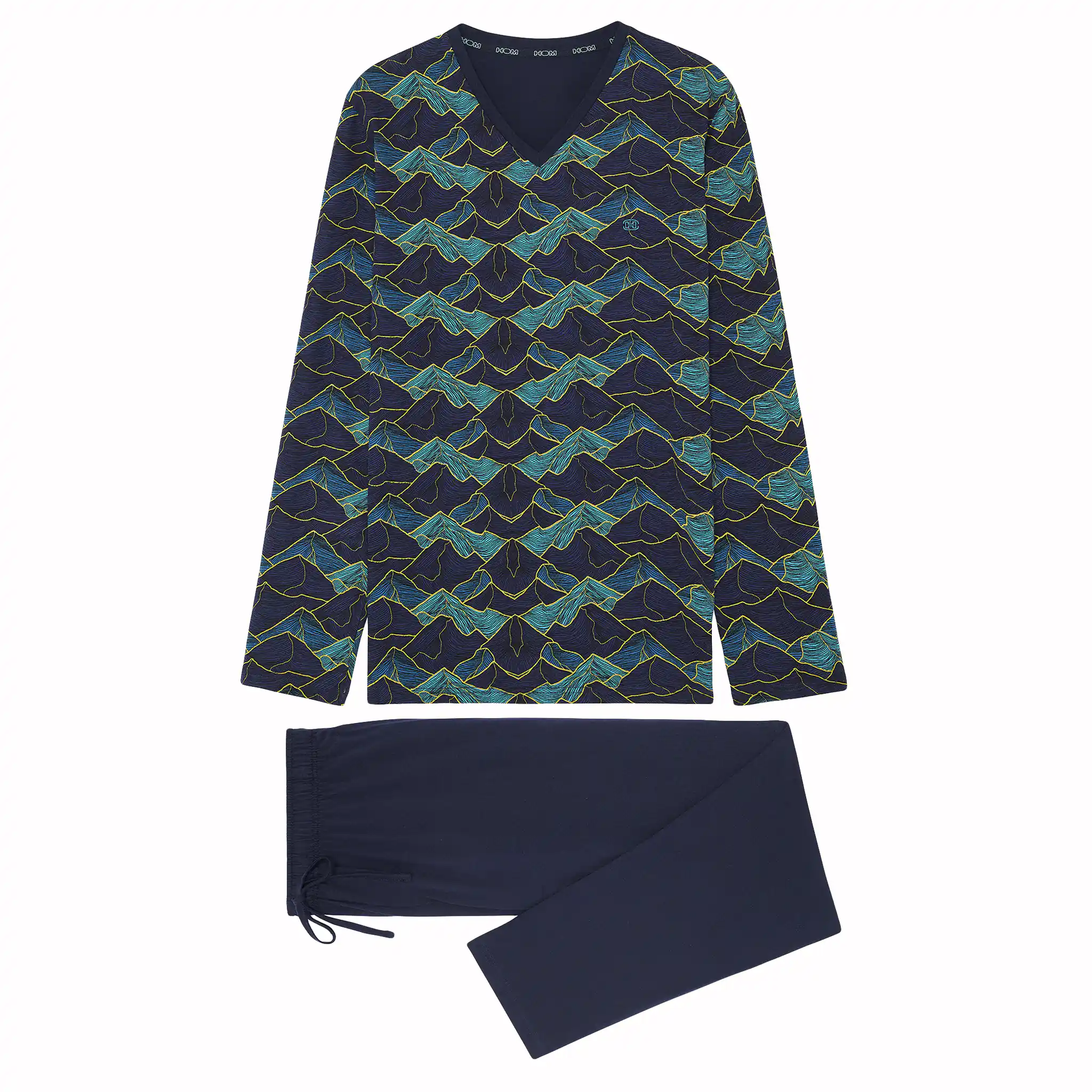 De Lino heren pyjama is gemaakt van 100% jersey katoen. Het T-shirt met lange mouwen, is uitgevoerd met een V-hals. Het shirt heeft een opvallende allover landschapprint van bergen in blauw tinten op een marine blauwe achtergrond. De lange broek in effen marine blauw heeft steekzakken in de zoom aan de linker en rechterzijde. De tailleband is elastisch en heeft een trekkoord. Doordat de pyjama is gemaakt van katoen is deze gemakkelijk schoon te maken en ademt deze goed. Perfect voor de man die graag natuurlijke stoffen draagt.