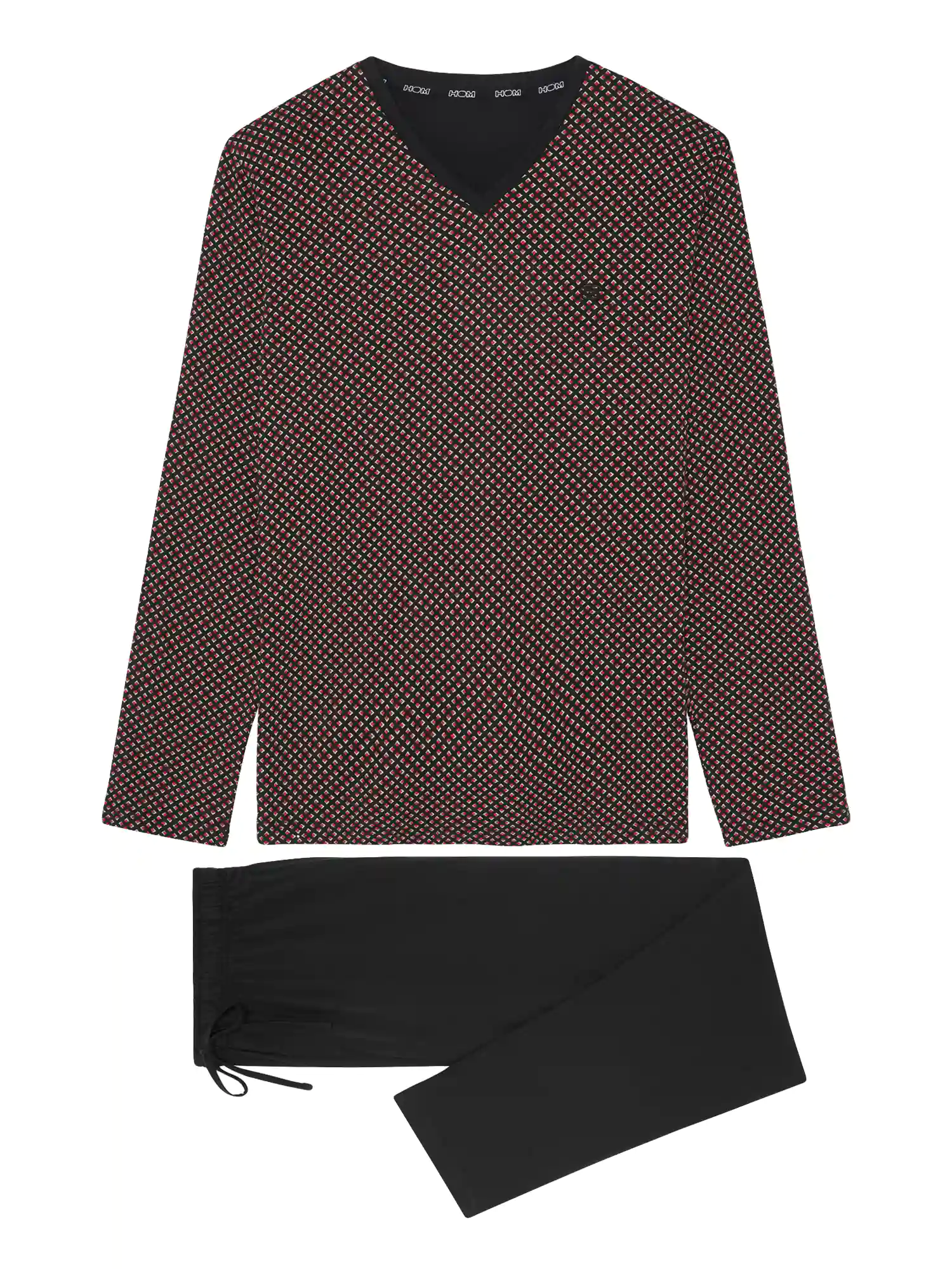 De Murray heren pyjama is gemaakt van 100% jersey katoen. Het T-shirt met lange mouwen, is uitgevoerd met een V-hals en heeft een twee kleurige geometrische print met witte en rode ruitjes op een zwarte achtergrond. De lange broek in effen zwart heeft steekzakken in de zoom aan de linker en rechterzijde. De tailleband is elastisch en heeft een trekkoord. Doordat de pyjama is gemaakt van katoen is deze gemakkelijk schoon te maken en ademt deze goed. Perfect voor de man die graag natuurlijke stoffen draagt.