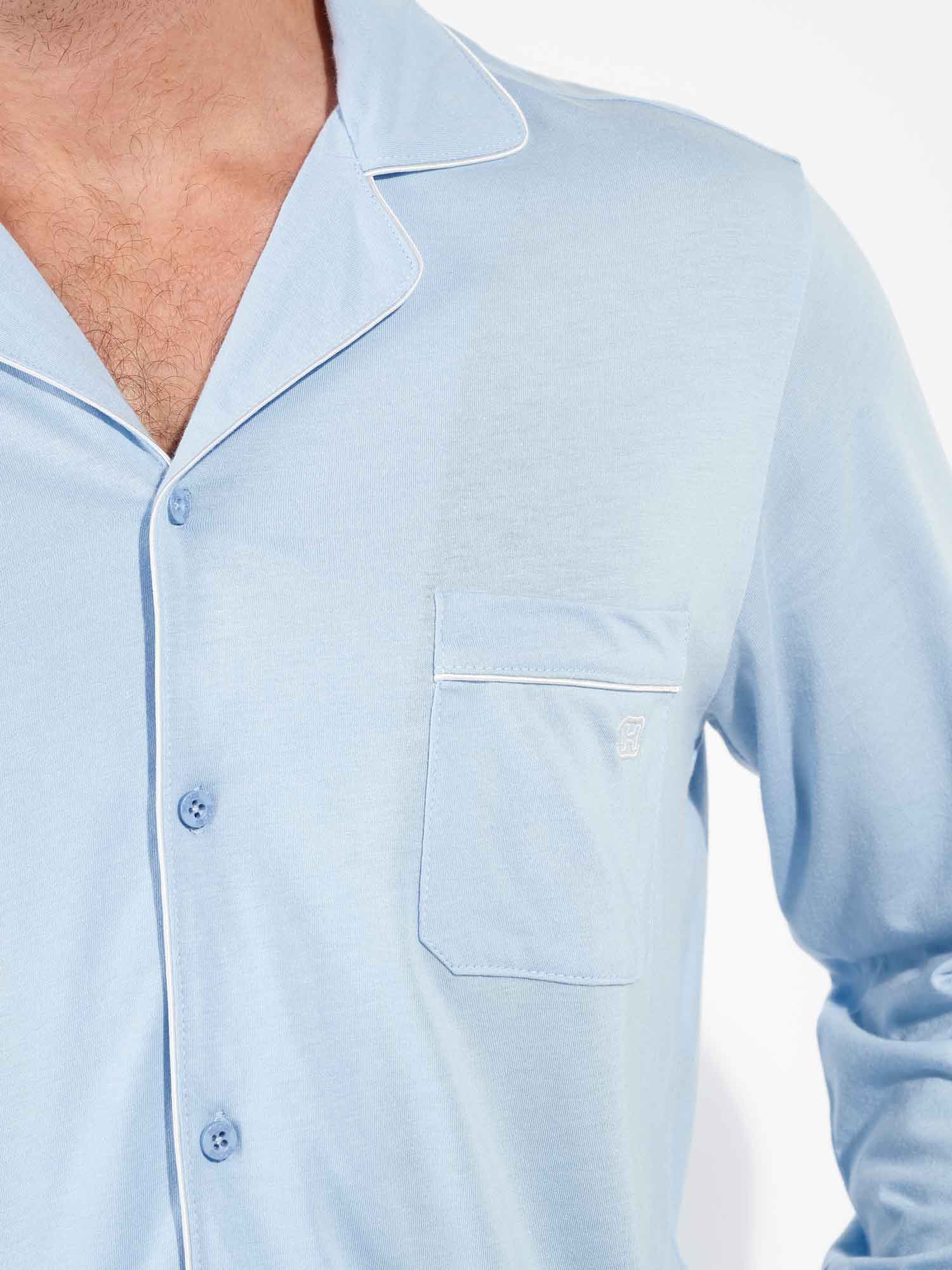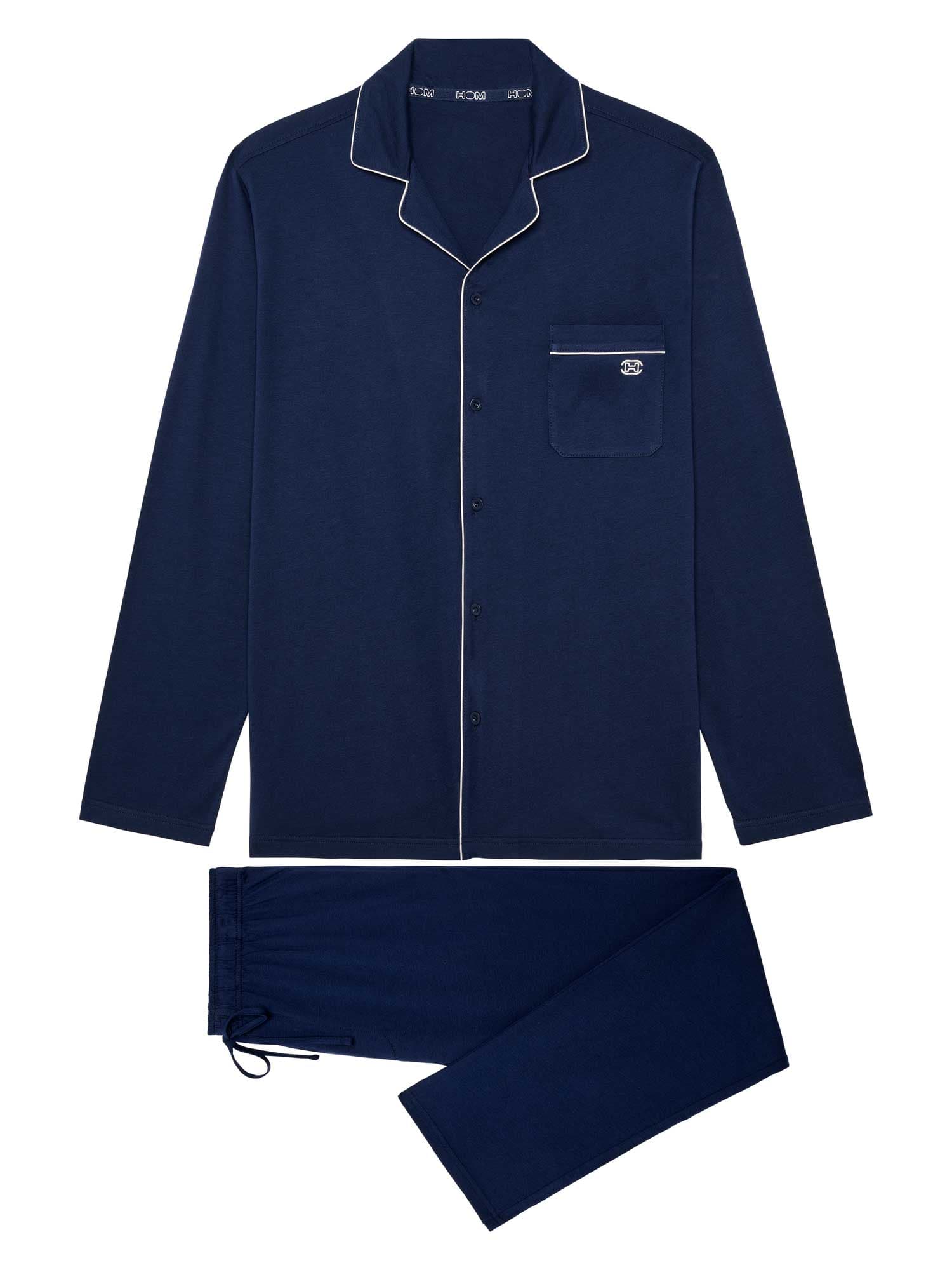 De Rafaeldoorknoop pyjama is een stijlvolle klassieker voor de moderne man die waarde hecht aan comfort én uitstraling. Deze lange heren pyjama is gemaakt van een zachte katoen-modal mix. Daardoor heeft deze pyjama een ademend gevoel en een soepele fit. De wit afgezette paspel geeft een elegante touch, terwijl de klassieke kraag, gegraveerde HOM-knopen en borstzak met subtiele geborduurde branding het geheel verfijnen. Of je nu een rustige avond thuis beleeft of ontspannen wakker wordt: met de Rafael slaap je comfortabel in stijl.