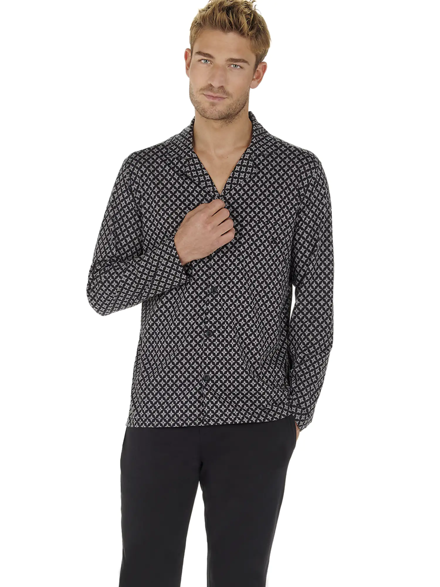 De Vince heren pyjama is gemaakt van 100% katoen. Het shirt met lange mouwen is geheel te openen met de knopen aan de voorzijde. Met ruit print in zwart wit heeft de Vince een elegant en klassiek design. De lange broek in effen zwart heeft steekzakken in de zoom aan de linker en rechterzijde. De tailleband is elastisch en heeft een trekkoord. Doordat de pyjama is gemaakt van katoen is deze gemakkelijk schoon te maken en ademt deze goed. Perfect voor de man die graag natuurlijke stoffen draagt.