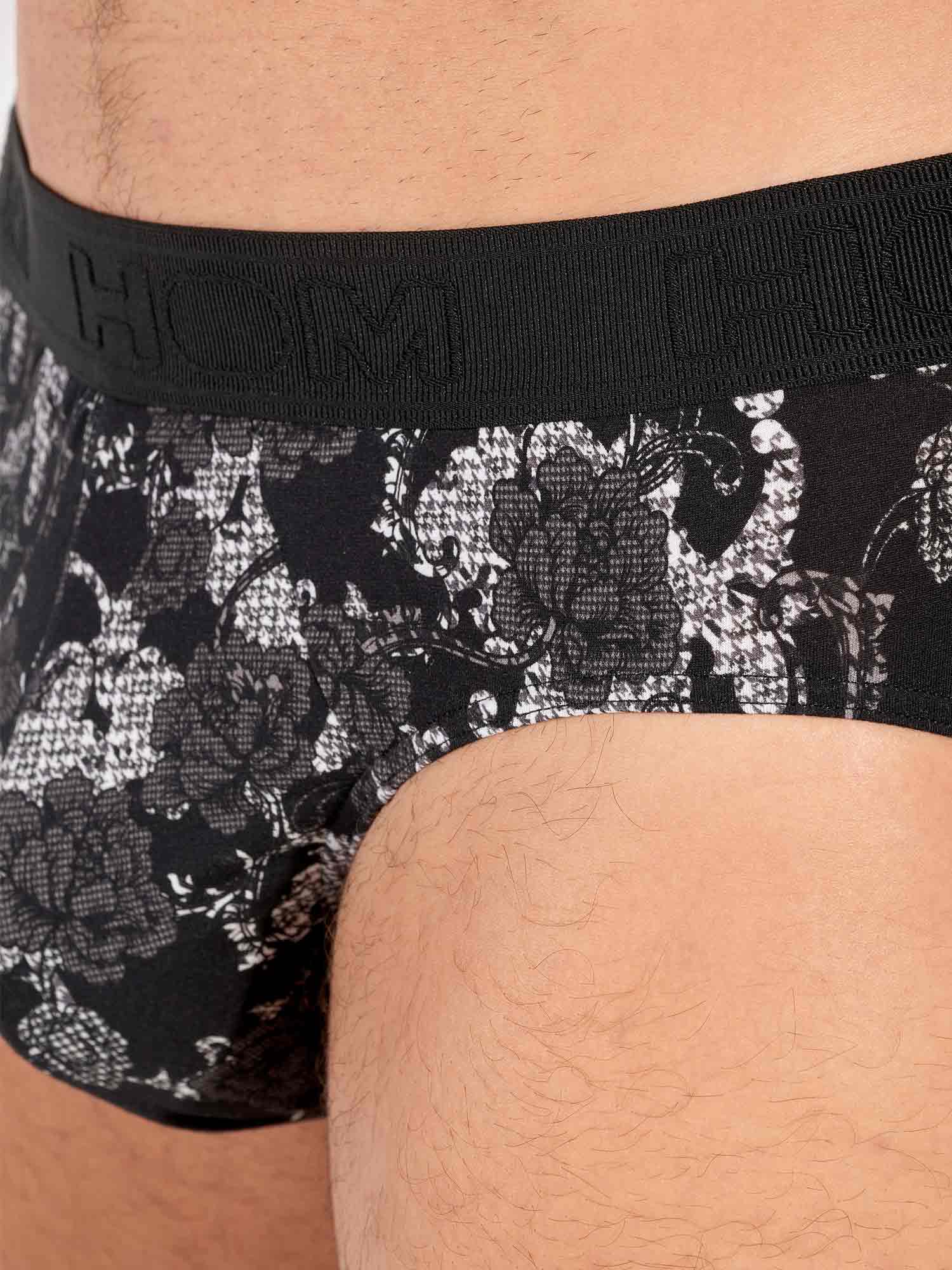 De Fairmont - mini slip van HOM combineert verfijning met ultiem draagcomfort. De luxueuze katoen-modal mix voelt zacht aan en ademt goed. De elegante jacquardstof toont een subtiel bloemenmotief over een grafisch pied-de-poule patroon in zwart en grijs. Dankzij de elastische afwerking sluiten de mini briefs mooi aan, terwijl de voering met elastiek voor een stevige en ondersteunende pasvorm zorgt. Voor de moderne man met oog voor detail.