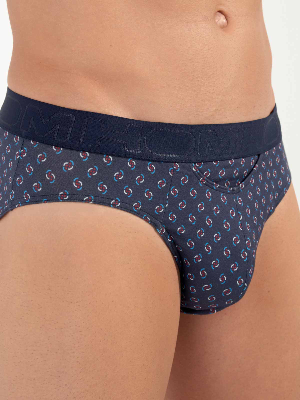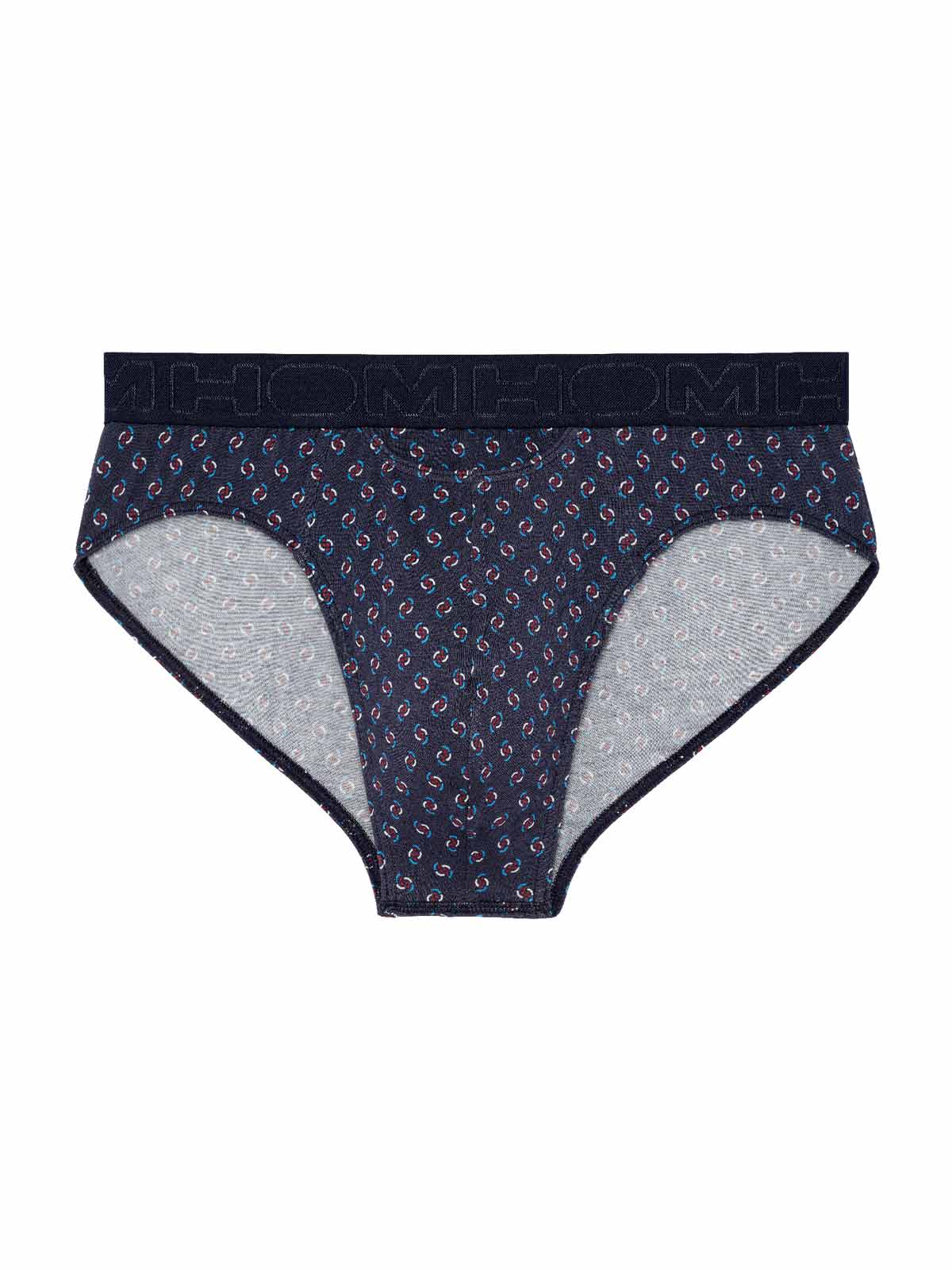 De Cyrus - HO1 Mini Briefs is gemaakt van hoogwaardig katoenmodal en uitgevoerd met de 'horizontale opening', de speciale gulp voor extra gemak, waar HOM bekend om staat. Deze heren slip heeft een bijzonder drie-kleuren motief op een marine blauwe achtergrond. De Rio heren slip heeft een elastische heupband gemaakt van katoen met daarop het HOM Logo.