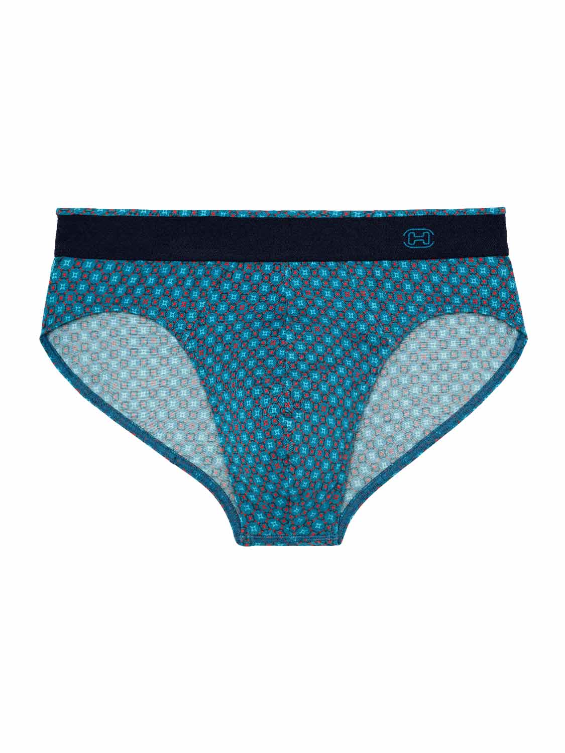 De Kuta - Comfort Mini Briefs is gemaakt van comfortabel katoenmodal en uitgevoerd met een comfort heupband, waarbij de stof over de elastische band naar binnen is geslagen voor extra comfort. Linksvoor op de comfortband is een klein label van HOM geplaatst. De Kuta heren slip heeft een speelse micro print in turquoise met oranje op een lichtblauwe achtergrond.