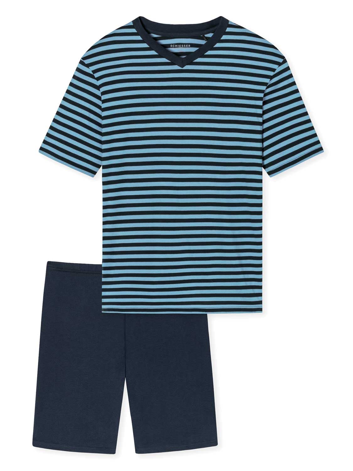 Korte heren pyjama van Schiesser gemaakt van 100% katoen. De pyjama beschikt over een effen short en een shirt met contrasterende strepen en een V-hals. De korte broek is uitgevoerd met een trekkoord in de heupband. De pyjama zit ruim en comfortabel en kun je wassen op een temperatuur van 60 graden.