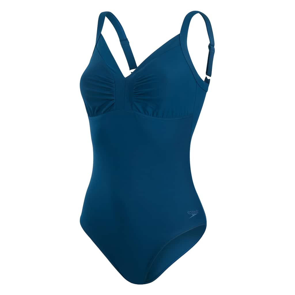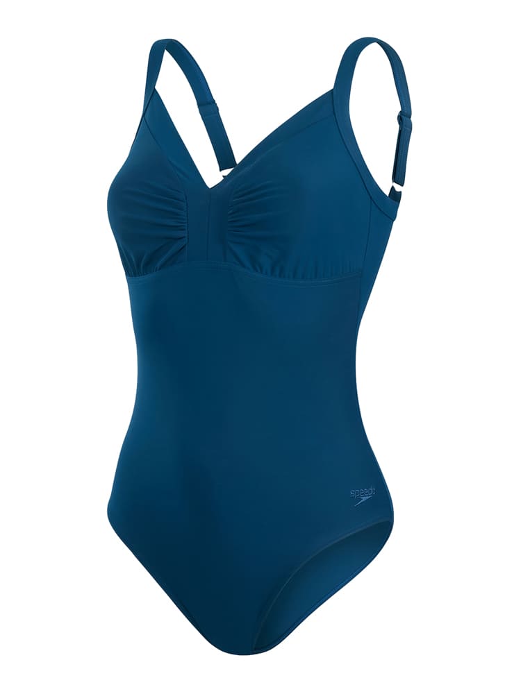 De Watergem is een sculpture badpak uit de Shaping collectie van Speedo met een tijdloos en elegant design. De sculpture stof sluit perfect aan op het lichaam en accentueert de vrouwelijke rondingen voor een mooi gestroomlijnd figuur, zonder in te leveren op draagcomfort. Het badpak biedt een medium borstondersteuning verweven in de stof en heeft een all-over shaping effect. De verstelbare schouderbandjes zorgen ervoor dat je het badpak perfect op maat kunt brengen. Door de zachte V-hals is dit badpak uitermate geschikt voor de dame die boven iets breder is of een grotere cup nodig heeft. De sculpture stof gaat tot 2x langer mee dan standaard badkleding wanneer je in chloor zwemt, waardoor je langer van je badpak kunt genieten.