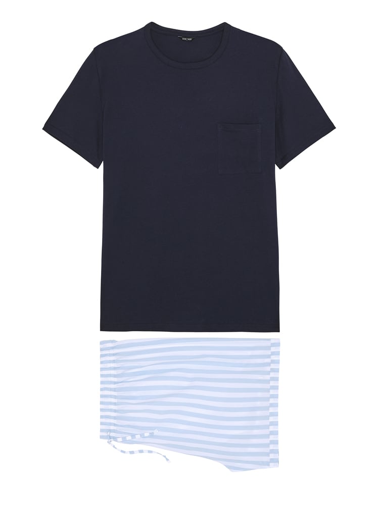 De NIOLIN is een korte heren pyjama gemaakt van 100% jersey katoen. Het marine blauwe shirt heeft korte mouwen met een ronde hals. Het short is uitgevoerd in de kleur blauw met verticale lijnen. Je vindt steekzakken in de zoom aan de linker en rechterzijde. De tailleband is elastisch en heeft een trekkoord. Doordat de pyjama is gemaakt van katoen is deze gemakkelijk schoon te maken en ademt deze goed. De ideale pyjama voor de man die graag natuurlijke stoffen draagt.