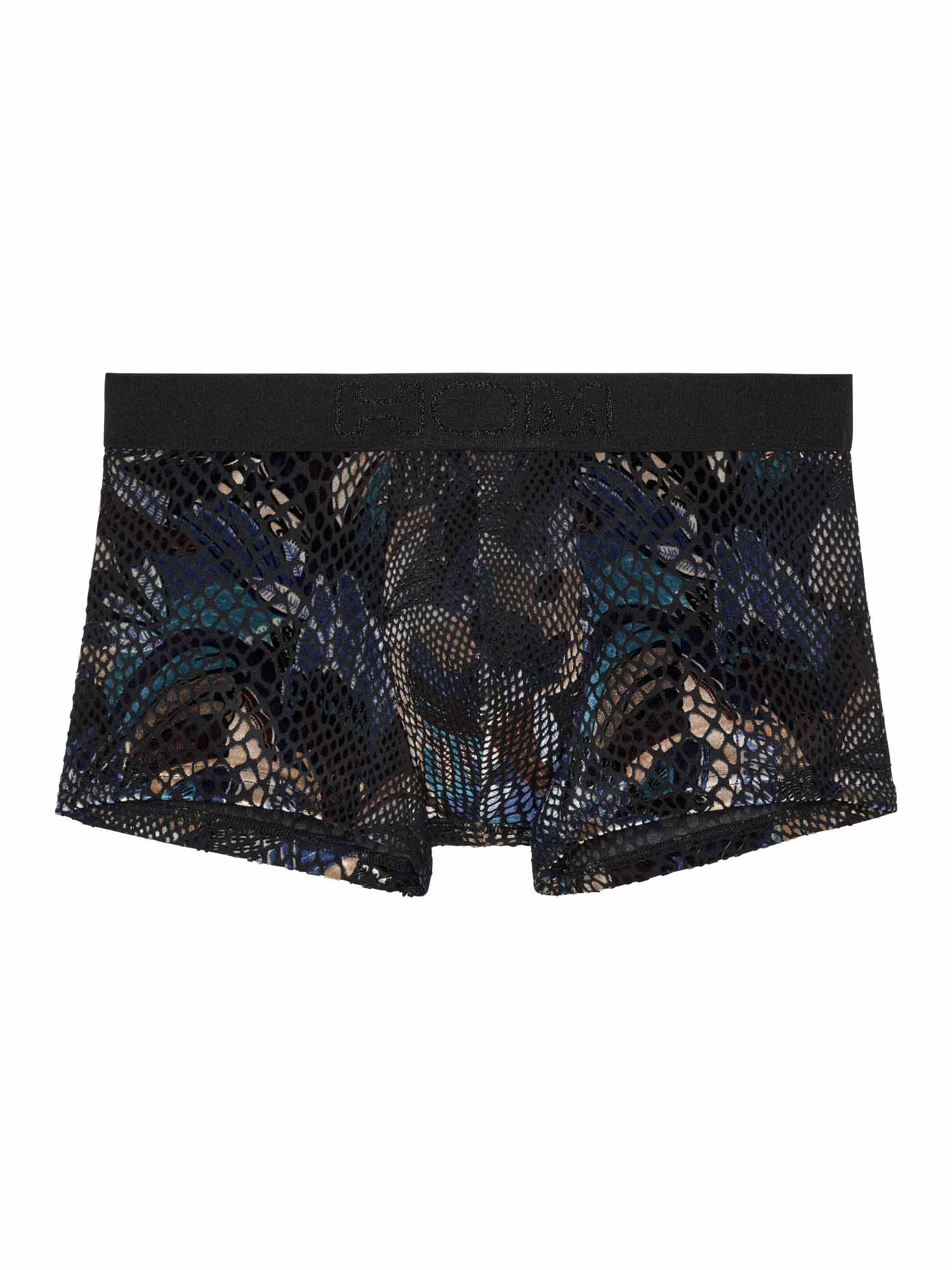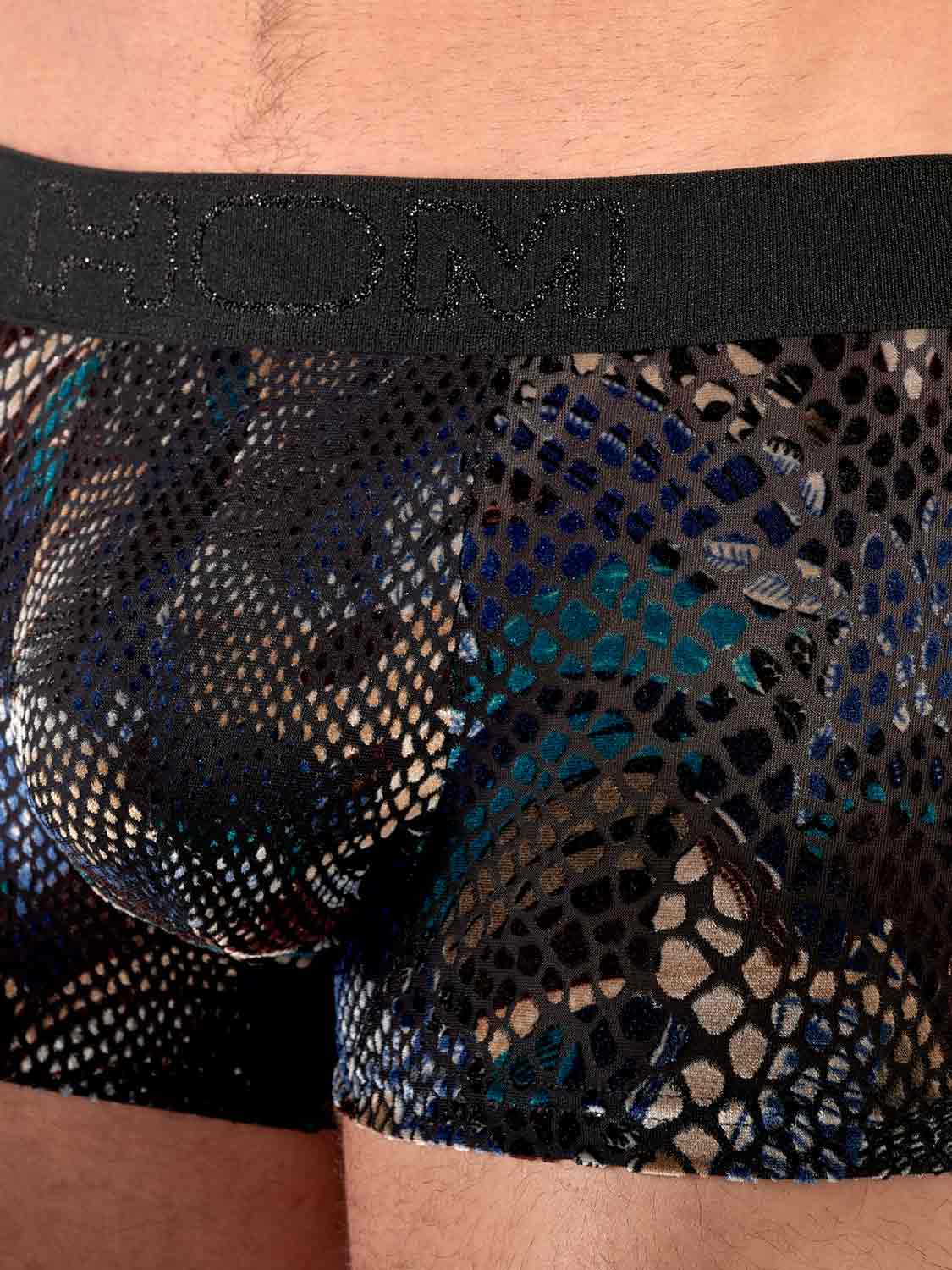 De HOM Cobra trunk is een gedurfd en sensueel model, vervaardigd uit devoré mesh met een opvallend dierenpatroon. De fluweelzachte flokprint creëert een weelderige textuur die niet alleen luxueus oogt, maar ook aangenaam aanvoelt tegen de huid. De diepe tinten blauw, brons en zwart versterken het exotische karakter. De voorkant is gevoerd voor extra draagcomfort zonder aan transparantie in te boeten. Een echte eyecatcher voor de zelfverzekerde man.